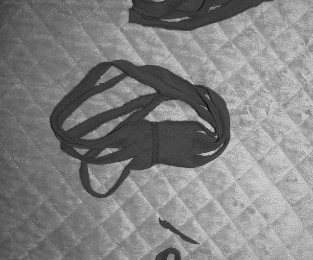 This mini Re-Style is a necklace made out of one of the sleeves of something that I am Re-styling. I really liked how it turned out. The color version is not good because the article of clothing that I used is red, and RED just did not look good on film. It was too much of a good color screaming at me . I converted the color to black and white. The material is sweatshirt, and it does not stretch like the tee shirt material, but I stretched it a little anyway to make it look worn. I made one out of a tee shirt sleeve as well. Lets give this necklace a name shall we. Lets call this necklace the Stringy Necklace. Ok, here are the instructions.